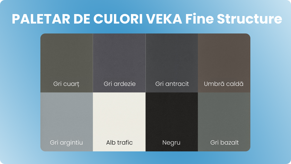 Suprafața VEKA Fine Structure amintește de ferestrele din aluminiu cu acoperire pulbere — atât ca aspect, cât și la atingere. Textura fină reflectă lumina în direcții diferite, creând un luciu difuz și un efect elegant de profunzime. Ferestrele colorate VEKA deschid posibilități nelimitate pentru designul interior și exterior.
