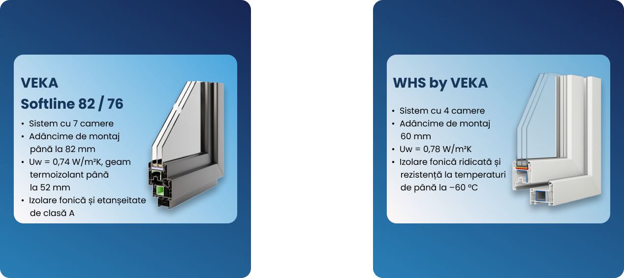 - VEKA Softline 82 / 76 — ferestre multicamerale de clasă premium, care oferă izolare termică și fonică maximă, durabilitate și fiabilitate;