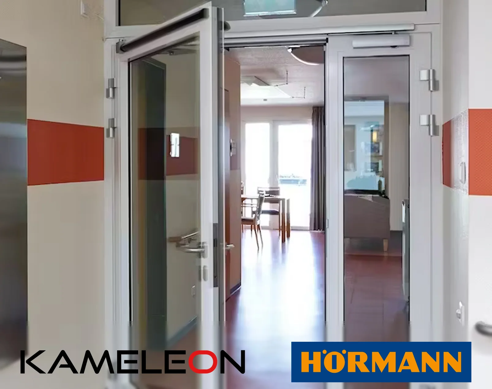Usi automate interior PortMatic KAMELEON, perfecte pentru zone cu acces frecvent, cu deschidere silențioasă și fără contact, pentru igienă sporită.