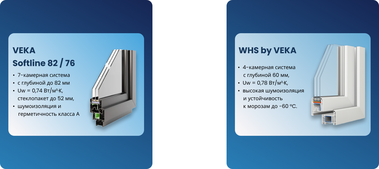 - VEKA Softline 82 / 76 — это многокамерные окна премиум-класса, обеспечивающие максимальную тепло- и шумоизоляцию, долговечность и надёжность;